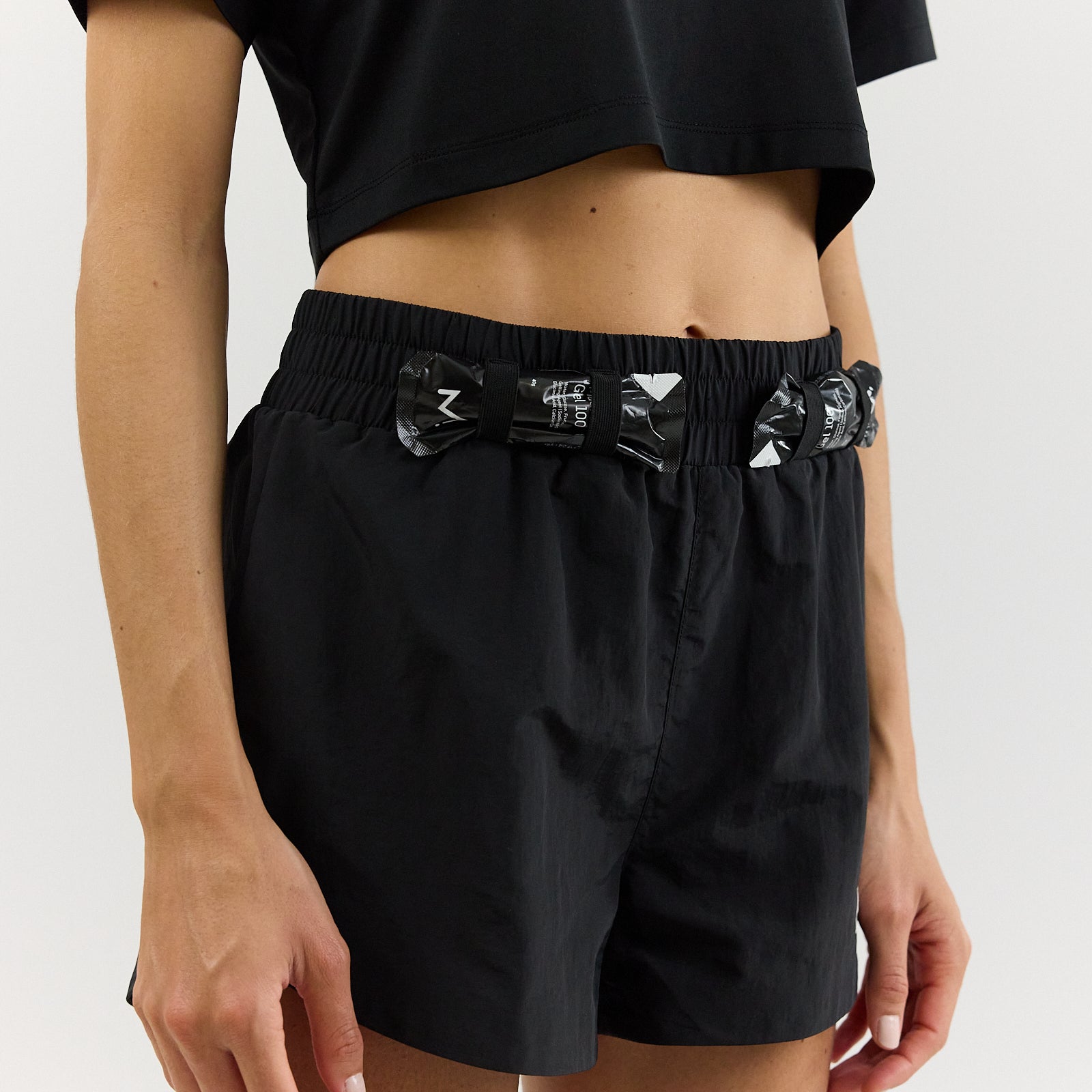 Élastiques intégrés à l’avant de la ceinture pour transporter des gels le jour de course.